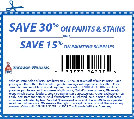From now through the end of January 2015, you can get 30% off Sherwin Williams paints and stains with the coupon found here. The same coupon will also save you 15% on painting supplies.